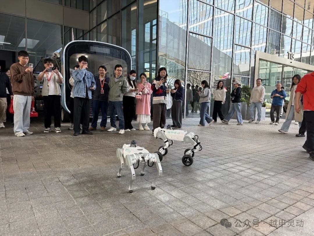 参观结束后,团队移步至园区中心区域,越甲灵动机器狗在现场进行了动态功能演示。机器狗灵活完成了行走、奔跑、跳跃等一系列高难度动作,凭借其优越的稳定性与环境适应能力,生动展现了我国在智能运动控制与仿生机器人领域的最新成果。精彩的表演迅速吸引了园区内众多员工驻足围观,大家纷纷举起手机记录下这一科技与商业空间交融的生动场景。